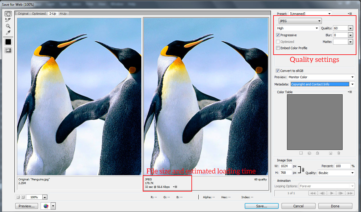 4. Alway keep and eye on the file size and estimated loading time displayed in the lower left corner while adjusting settings. At the same time, look at the image quality to make sure it is not over-optimised.